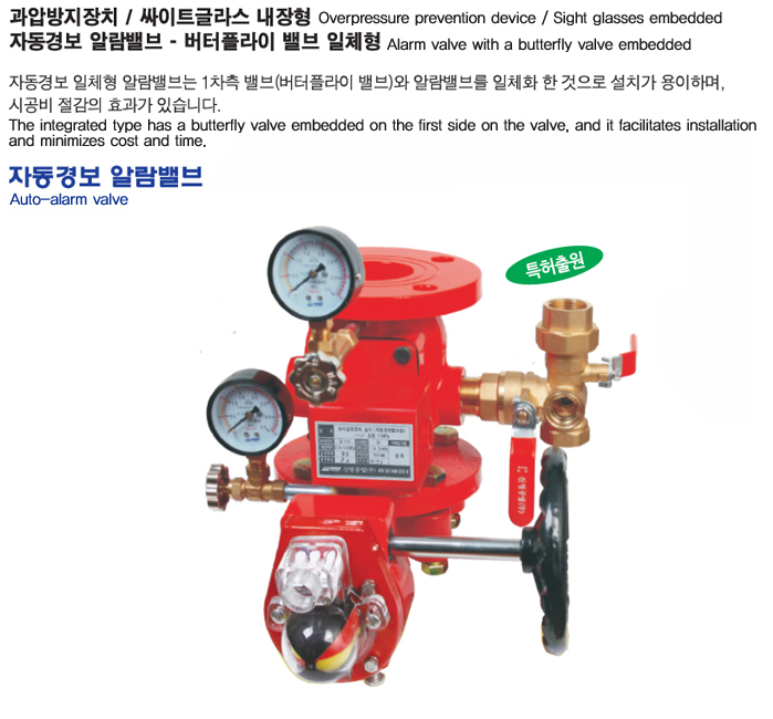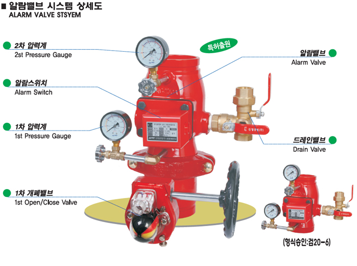 The alarm valves of Shinyoung are optimized and essentially used for the sprinkler system. They detect the flow of water and alert a fire alarm when there is a fire. The alarm valves of Shinyoung are carefully examined by KFI(Korea Fire Institute) undertaking strict internal pressure tests, functional examinations and visual inspections. The alarm valve is consisted of an alarm switch, pressure gauges, a clapper, and other pipes.